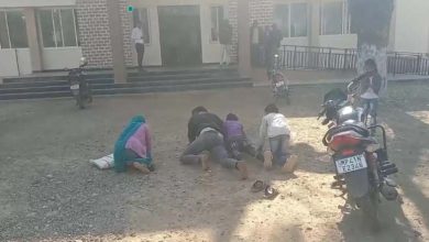 A farmer, his wife and three children walked on their knees at the sub-divisional magistrate office complex in Khategaon in Madhya…